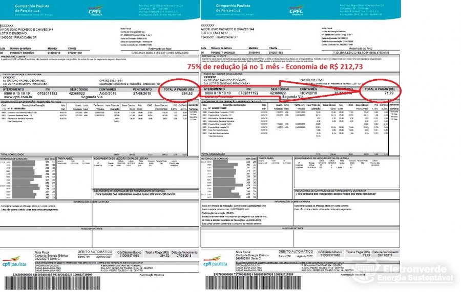 <- No exemplo da conta ao lado, o sistema reduziu o valor p/ 25% economizando R$ 212,73 já no primeiro mês, pagou a conta com a economia. Em 4-5 anos de aplicação da economia, o sistema se pagará, e à partir dali é tudo poupança.